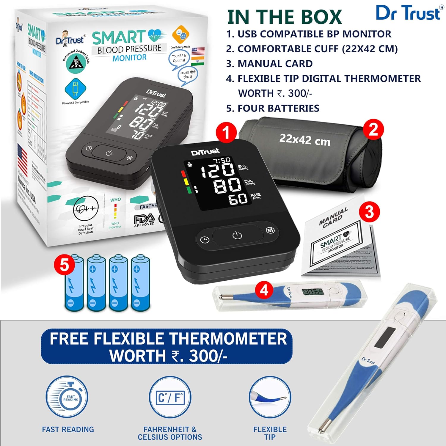 - In the Box: Box contains blood pressure monitor Dr. Trust Digital Thermometer, Batteries (Batteries not chargeable), Conical Cuff